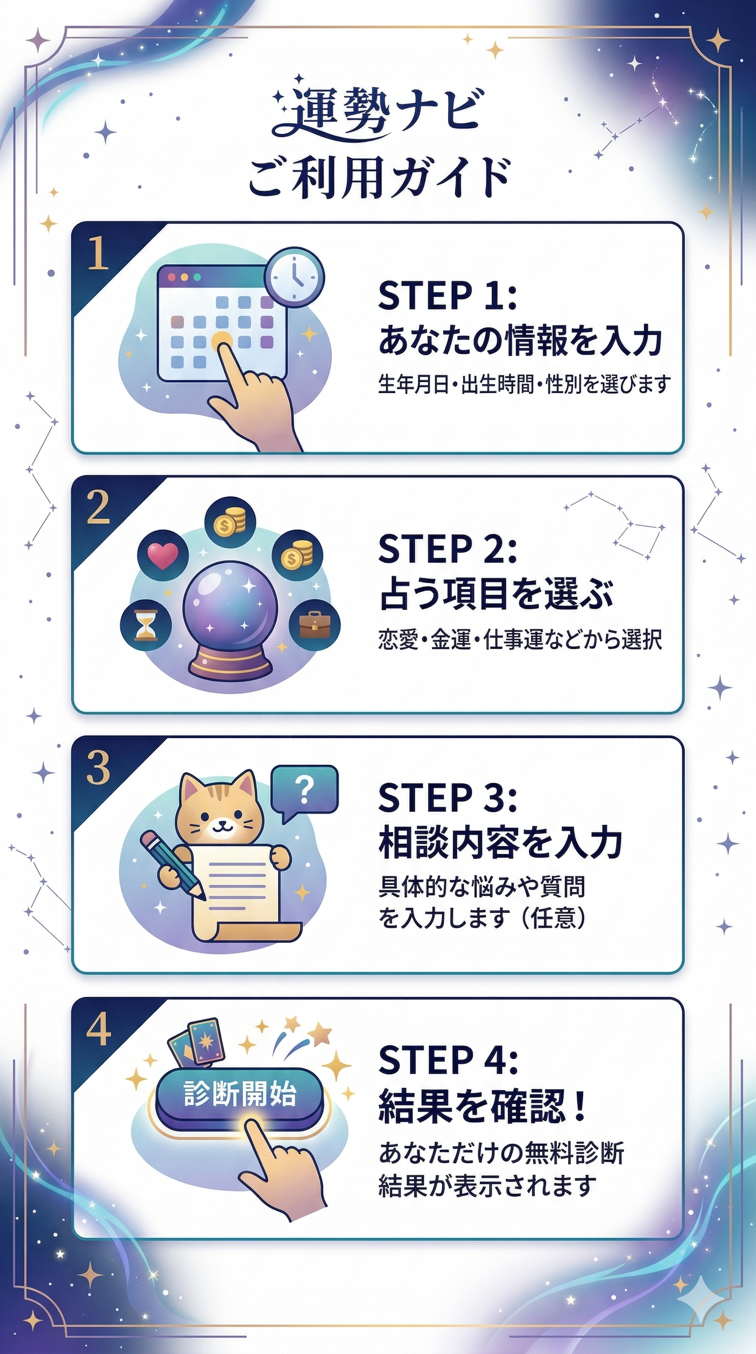 生年月日と名前から、あなたの恋愛運・仕事運・金運を本格鑑定。古代の叡智と最新AIが融合した運勢ナビで、今年の総合運から日々の細かなお悩みまで今すぐ診断できます。